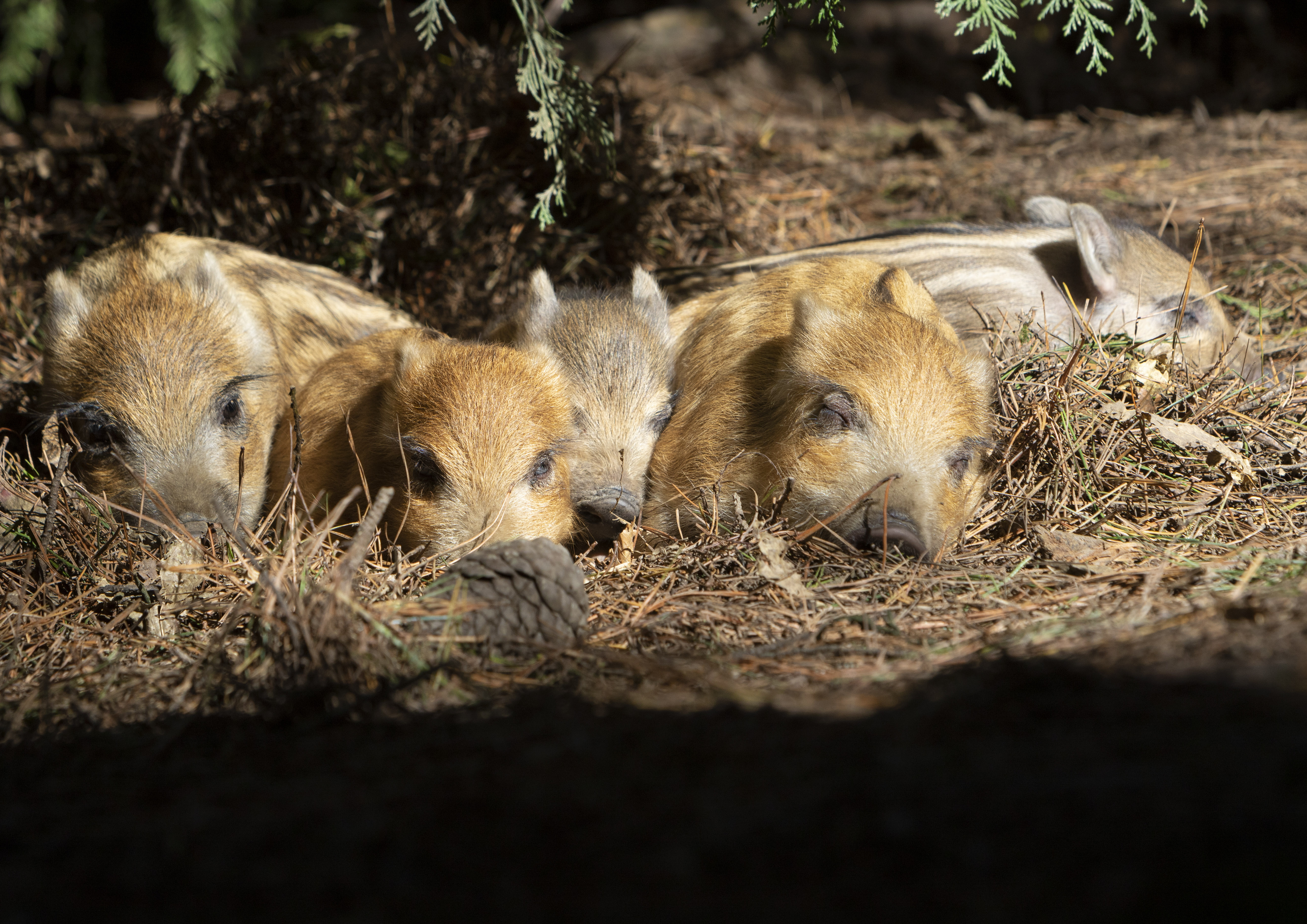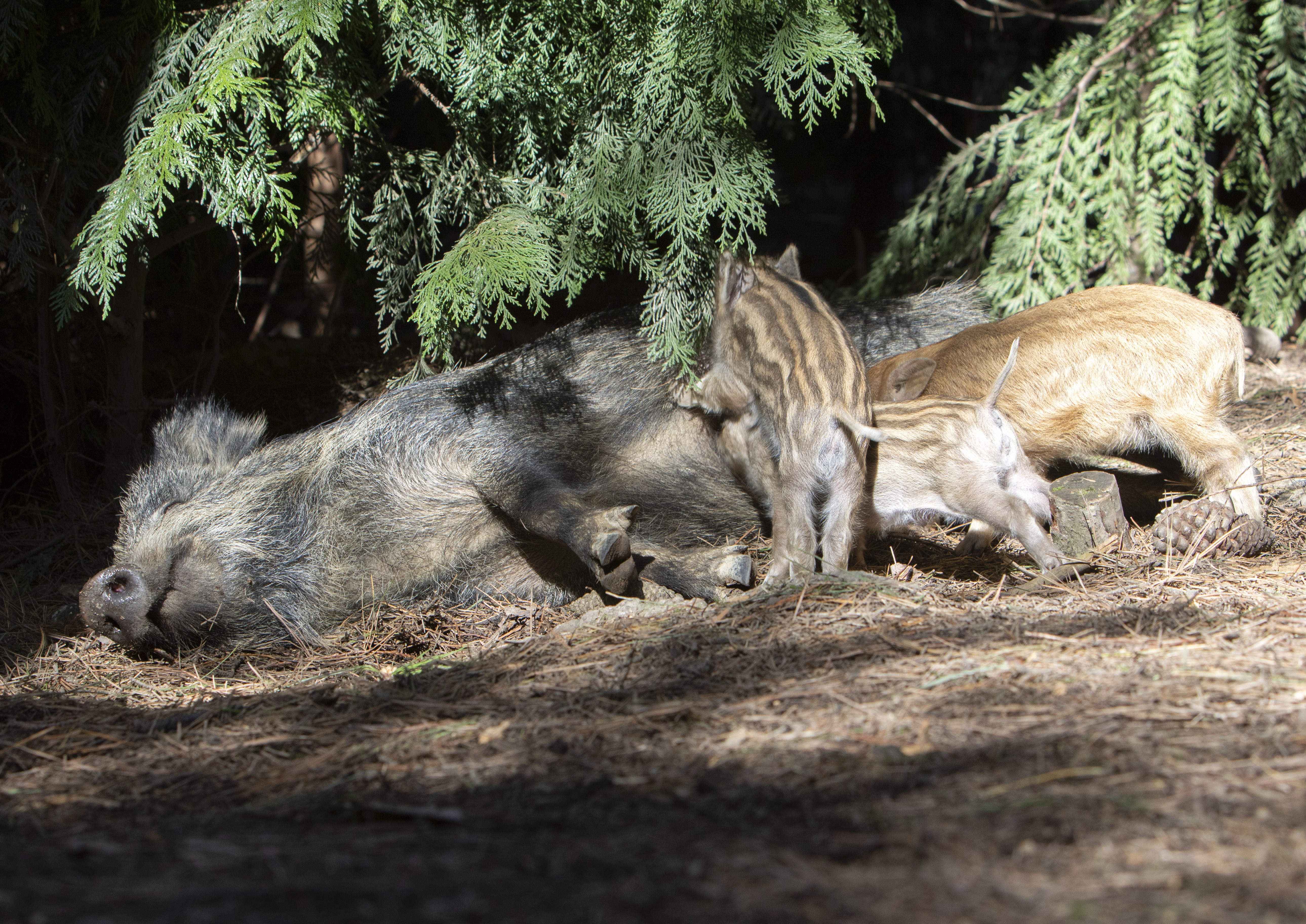 This sow was suckling two very different sizes of humbug, which makes me suspect that she has adopted the offspring of another female. The humbugs weren’t bothered by the arrangement. One good feed later and all were fast asleep in the sunshine. Had the ground not been so uncomfortable, I would have been as well.